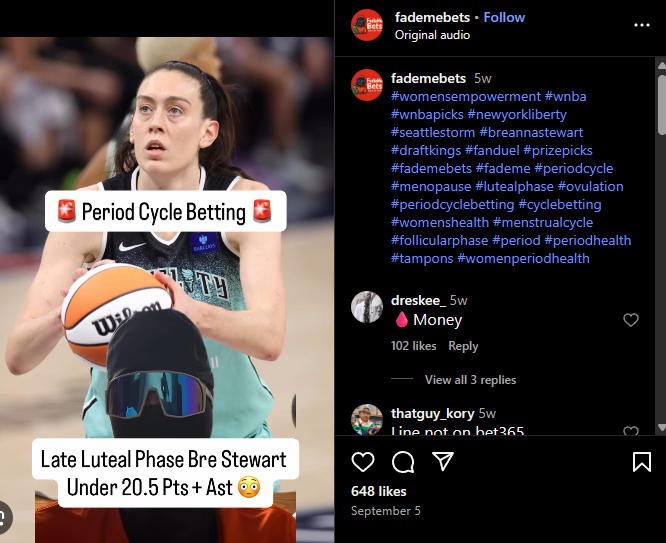 在本赛季WNBA收官之际,这种“赌月经”的策略越来越受到人们的青睐,一些人会在网上“预测”球员的月经周期,对她们的比赛表现进行下注,有些人甚至将其戏称为“血钱”。