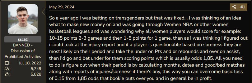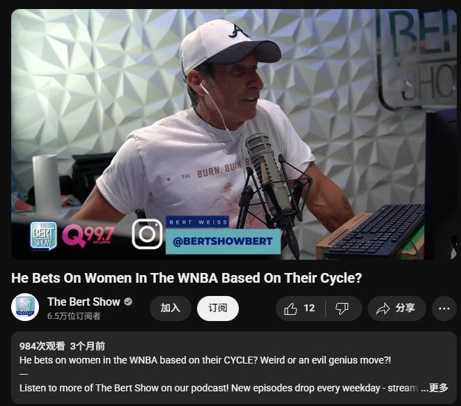 有人说自己之前想到了赌变性人,但这个漏洞被堵上了(可能是赌博网站不让了…),然后他就想到了去赌WNBA球员的月经周期。