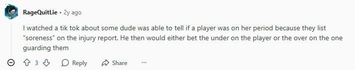 有人说自己在TikTok上刷到过视频,有个哥们能从伤病报告中的“酸痛”中看出某运动员是不是来了月经,然后就去赌她表现不好,或者防守她的敌方球员表现好……