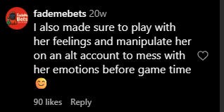 甚至@FadeMeBets本人也承认这一点,之前在预测芝加哥天空队球员Courtney Vandersloot的月经时,他在评论区中写道:“我会故意玩弄她的感情,在比赛前用小号操纵她,扰乱她的情绪(来确保赌博成功)。”