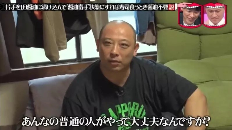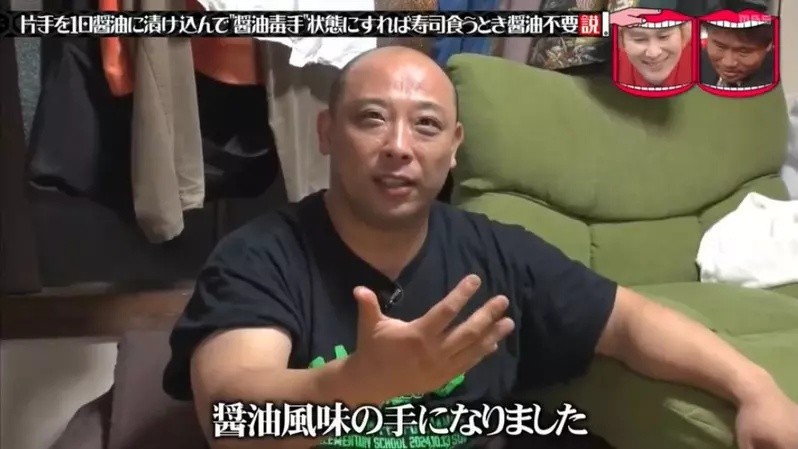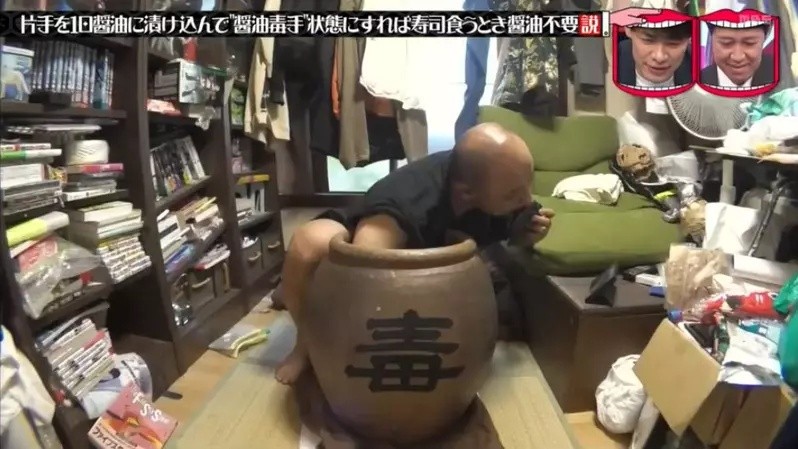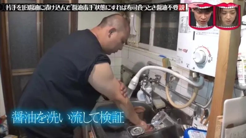 近日,日本TBS电视台的综艺节目《水曜日的Downtown》,想试试看能不能练出“酱油毒手”,于是做了一个企划:把一只手泡在酱油里一天,练成“酱油毒手”之后,吃寿司就不用蘸酱油了吗?