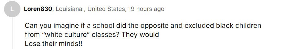 “你能想象,如果一所学校反过来,把黑人孩子排除在‘白人文化’课之外会怎样吗?他们疯了吧!”