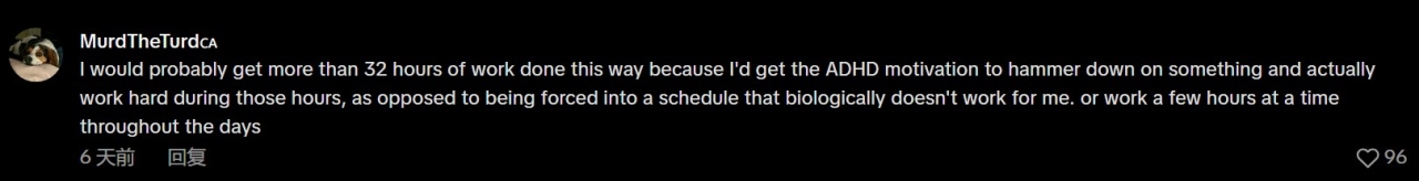 “以这种方式,我可能会超额完成32小时的工作量,因为我能在那段时间里,靠多动症带来的专注动力全力投入工作,而不是被迫遵循一个并不合适我生理波动的固定时间表。或者,我可以在一天内分几个时段完成工作。”