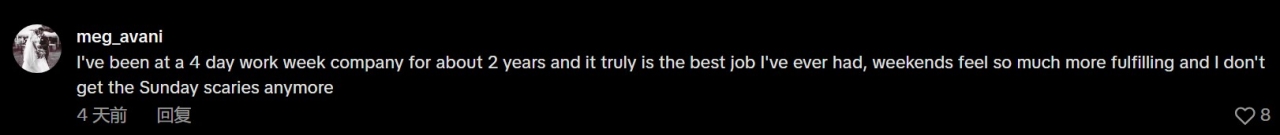 “我在一家实行四天工作制的公司干了大约两年,这真的是我做过最棒的工作,周末感觉充实多了,而且我再也不会产生‘周日焦虑’了。”