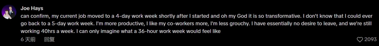 “我能证明这点。我现在的工作,在我入职不久后就改成了四天工作制,天哪,那改变可太大了。我不知道我还能不能回到每周五天的工作状态。我的工作效率更高,也更喜欢同事了,心情也不那么暴躁了。我基本没有离职的想法,而且我们每周仍然工作40个小时。我只能想象一下,每周工作36小时会是什么感受。”