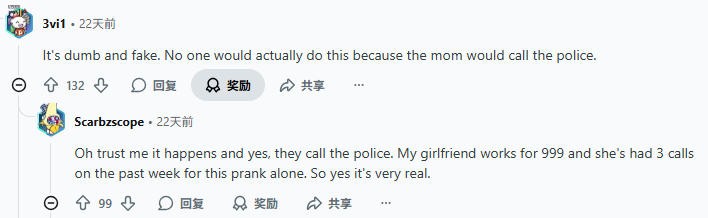 “确实,相信我,这种事已经发生了,已经有人报警了。我女朋友在999工作,过去一周她就因为这个恶作剧接到了三通报警电话。所以是的,家人真的会担心到报警的。”