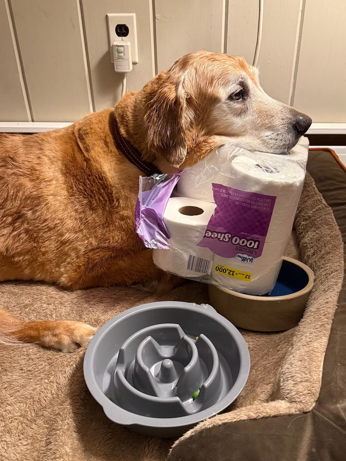 她给杜克准备了各种各样的狗玩具,让它忙个不停,她每天带着它去户外活动足够长的时间消磨它的体力和精力,但不管咋样,等到睡觉的时候,家里任何没被钉住的东西都有可能成为它的床伴。