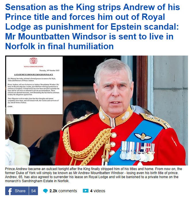紧接着10月30号,最新消息果然来了:安德鲁最后的“王子”头衔也将被剥夺,今后将作为“安德鲁·蒙巴顿·温莎”活动。
