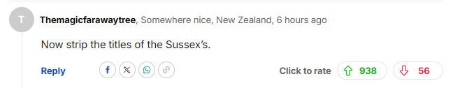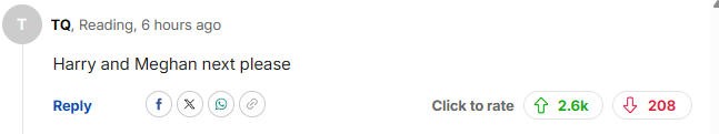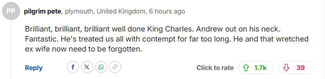 “爽,爽,爽!查尔斯国王干得太棒了。安德鲁下台了,真好。他蔑视我们太久了。他,跟他那个可恶的前妻,现在都应该被遗忘。”