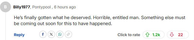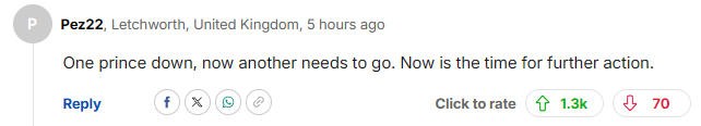 “他终于遭报应啦!这个可恶的,自以为是的家伙。肯定是又有其他丑闻要曝光了,王室才提前断尾求生。”
