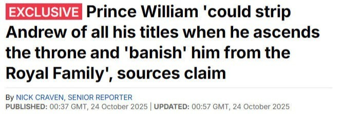 10月中旬,第不知道多少次把脸丢尽的安德鲁被王室剥夺了剩余的部分头衔和荣誉,包括“约克公爵”这个最大的头衔、皇家维多利亚勋章大十字骑士勋位、嘉德勋章皇家骑士勋位,只保留出生即自带的“王子”头衔。