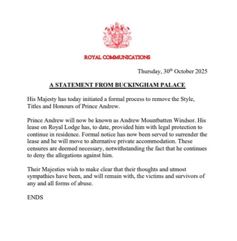 “安德鲁王子从现在起,将改名为安德鲁·蒙巴顿·温莎。到目前为止,他与皇家小屋的租约为他提供了居住于此的法律保障。但现在已正式发出通知,要求他交出租赁权,他将搬到其他私人住所。尽管他继续否认针对他的指控,这些惩戒措施仍被视为必要。”