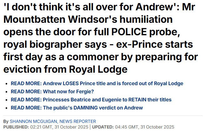 有王室作家认为,安德鲁面临的灾难其实只是个开头,爱泼斯坦案的余波至今仍未完结,且几乎一定会牵扯到他身上,警方很可能会对他发起全面调查,而失去了王室的保护,他还有什么呢?