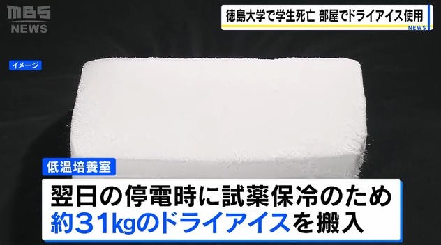 德岛大学表示,研究室因第二天停电需防止室温上升,于是放入约31公斤干冰作为制冷剂。如果这批干冰一次性全部升华,释放的二氧化碳量将超过房间容积的一半。