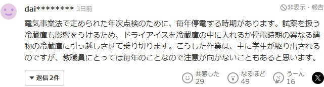 “根据《电力业务法》的规定,每年都会有一段时间因年度检查而停电。用于储存试剂的冰箱也会受到影响,所以我们会在冰箱里放入干冰,或者将试剂转移到停电时间不同的大楼中的其他冰箱。这些工作主要由学生完成,但由于教职工每年都会遇到这种情况,他们可能不会太在意。”