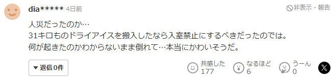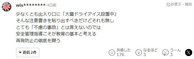 “他们至少应该在入口处张贴‘已放置大量干冰’的警告标志。如果没有设置这些警告标志,就不能称之为‘意外事故’。我认为安全管理培训是教育的基础,希望他们能彻底杜绝此类事件再次发生。”