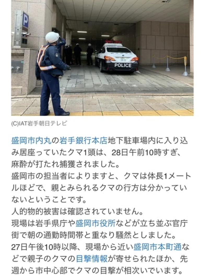 10月29日,一只黑熊撞破山形县南阳市一所小学的玻璃门,闯入校园,引起恐慌。为应对危机,南阳市不得不安排公务员每天清晨和夜间巡逻,然后就发生了公务员被袭击的悲剧…