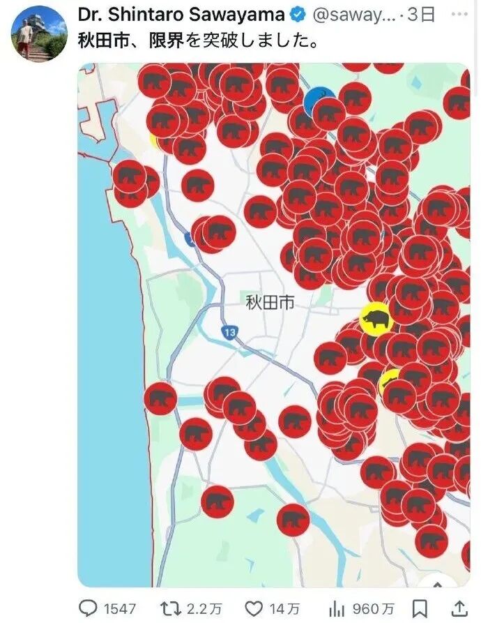 秋田县一位消防员疲惫地说:“我们每天接到几十起熊目击报告,都快应付不过来了。”