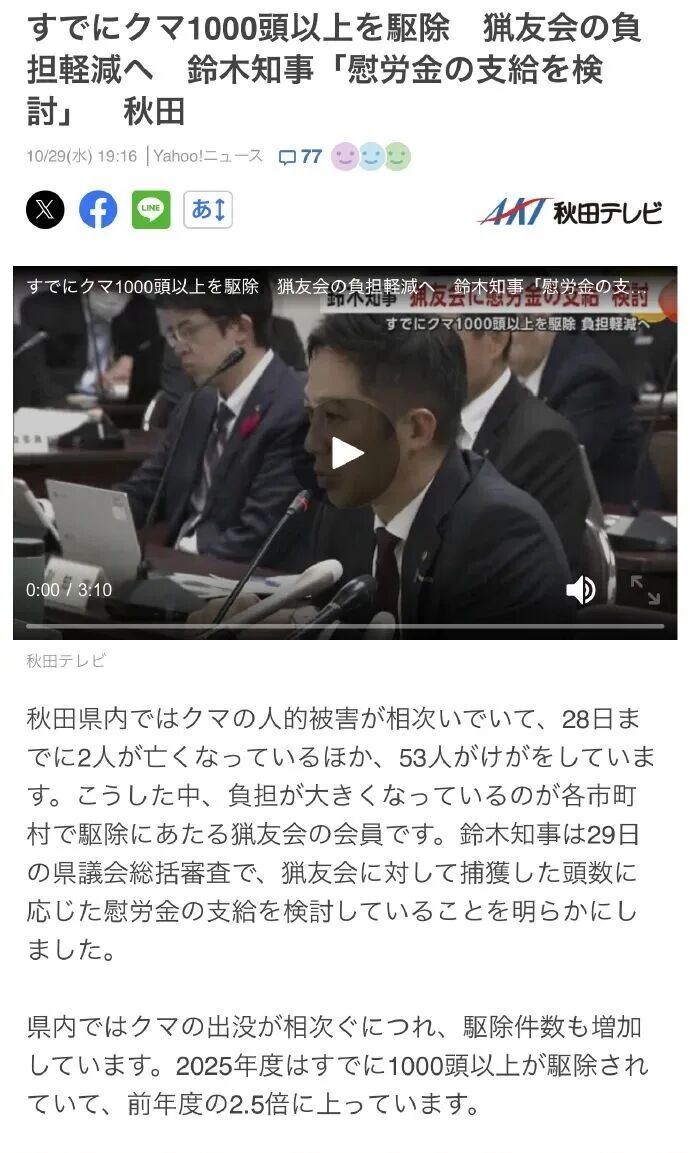 秋田县是熊害最严重的地区,已经有52人受伤、2人死亡。为加速推动防熊措施,秋田县政府宣布,猎人在11月1日至明年2月15日的狩猎季期间,每捕获一只熊可获得1万日元奖励。