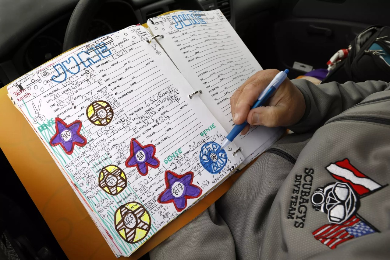 每次潜水后,汉森都会戴上眼镜,认真地在一本色彩鲜艳的手工潜水日志中记录: