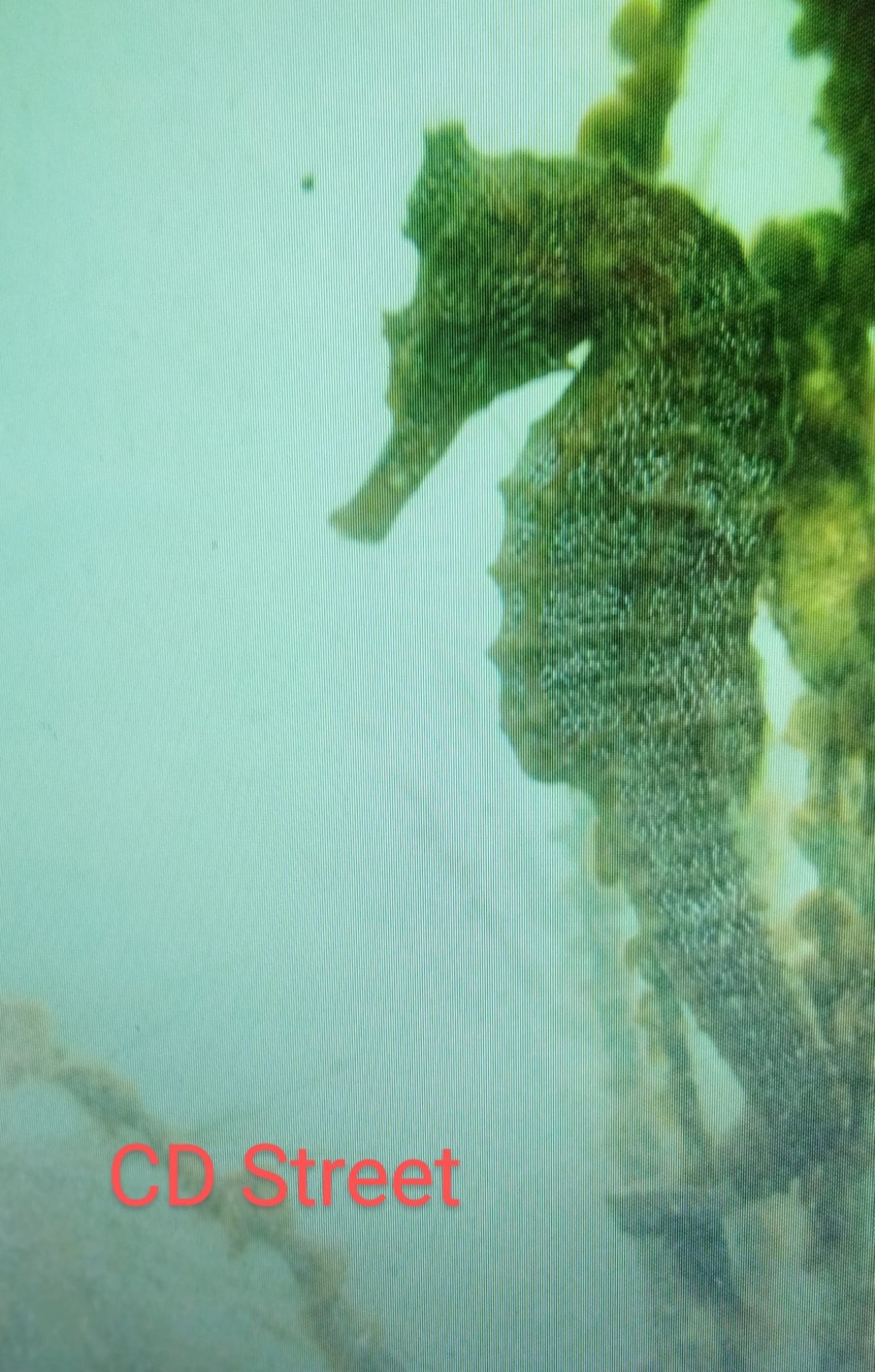 他会拿着一根塑料帐篷桩当作拐杖,把它插进海底,一点点带着自己和游客前进。当他发现海马时,他会用这跟桩子做指示,这时你就得透过浑浊的海水努力辨认。然后,它出现了。