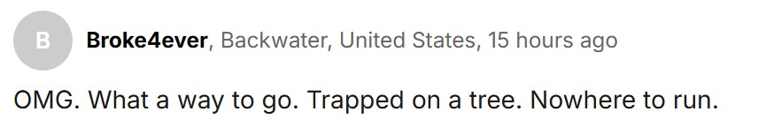 “我的天哪。这种死法也太惨了吧。被困在树上,无处可逃。”