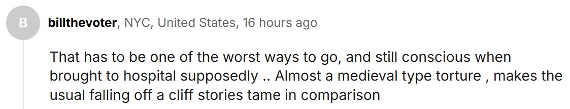 “这恐怕是最惨烈的死法之一了。据说他们被送到医院时还保持着意识……简直像中世纪的酷刑。相较之下,那些常见的坠崖身亡故事都显得不值一提了。”