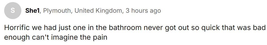 “太可怕了,之间我们家浴室里只出现过一只,我吓得立刻冲了出去,这都已经够糟糕的了,简直无法想象他们所承受的痛苦。”