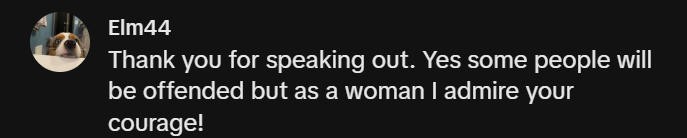 “感谢你勇敢发声。我知道有些人可能会觉得被冒犯,但作为一名女性,我佩服你的勇气!”
