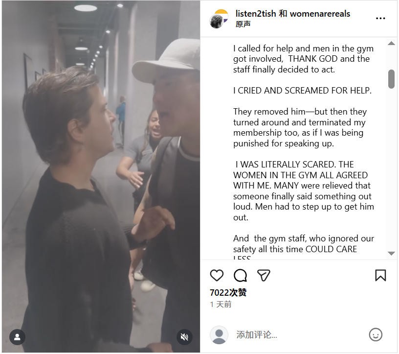 更衣室门口,一位男会员看不惯,跑来跟跨性别女对峙。