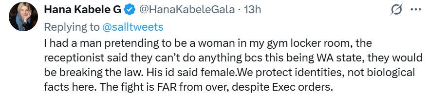 “我的健身房更衣室里有个男人假扮女人,前台说他们也没辙,因为这里是华盛顿,那样就违法了。他的身份证上写的是女性。我们这里保护的是身份,而不是生理特征。尽管有行政命令,这场斗争远没有结束。”
