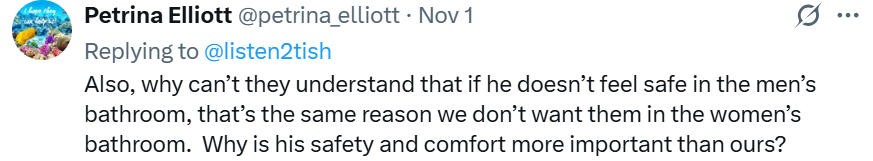 “还有,他们为什么就不理解,如果他觉得男洗手间不安全,那也是我们不想让他们进女洗手间的原因啊?为什么他的安全和舒适比我们的更重要?”