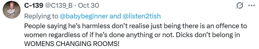 “那些说他没恶意的人根本没意识到,不管他有没有做什么,他待在那里本身,就是对女性的一种冒犯。男性的生殖器就不该出现在女性更衣室里!”