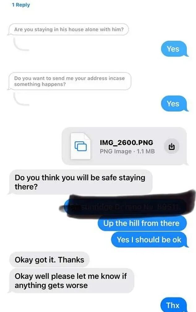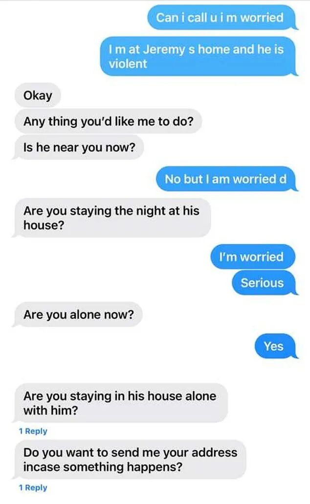 在ZhouYi提供的短信记录中,她告诉同事雷纳疯了,她为自己的安全担忧。同事也建议她:“你能把自己锁在浴室里吗?他听起来像疯了一样。”