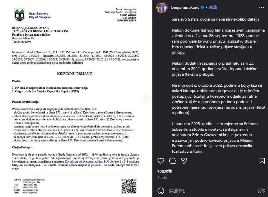 也正是因为这部《萨拉热窝狩猎》,萨拉热窝前市长卡里奇才会在2022年提交那份刑事诉讼。