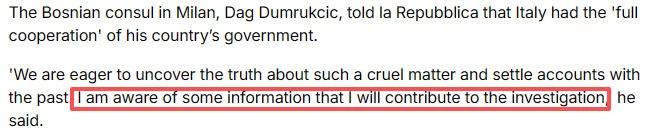 至于波斯尼亚方面,对此无疑非常支持,近日,波斯尼亚驻米兰领事对意大利媒体表示,波斯尼亚政府将会全力配合意大利的调查: