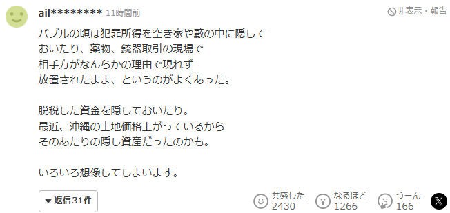 “在泡沫经济时期,把犯罪所得藏匿于空置房屋或灌木丛中,或是毒品和枪支交易的另一方也可能因各种原因缺席,留下无人认领的现场。也或许是藏匿了逃税所得。这不禁让人浮想联翩。”