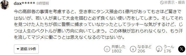 “考虑到如今老年人的生活状况,在空置房屋里发现1亿日元并不稀奇,但年轻人轻易获得巨额财富后,往往会挥霍无度。即便捡到钱的人没有被警察抓到,他们或许会觉得自己很幸运,但实际上,他们的人生轨迹将从此走上歧途。他们永远不会忘记这段经历,或许从此以后就再也不愿意努力诚实地工作了。”