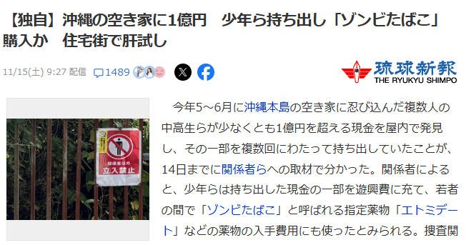 今年5月至6月期间,日本冲绳县一群少年偷偷闯入当地的一间空屋,没想到在屋里发现超过1亿日元(约合人民币459万元)的巨额现金。