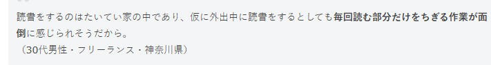 “我通常在家看书,即使出门在外看书,每次都要撕下想看的部分也很麻烦。”