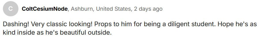 “英俊潇洒!很古典的长相!他是个勤奋好学的学生,很值得称赞。希望他的内心也像外表一样美好。”