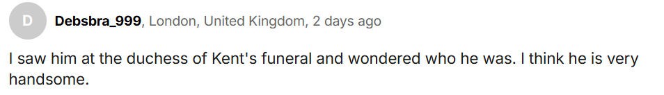 “我在肯特公爵夫人的葬礼上见过他,当时我就很好奇他是谁。我觉得他长得很帅。”