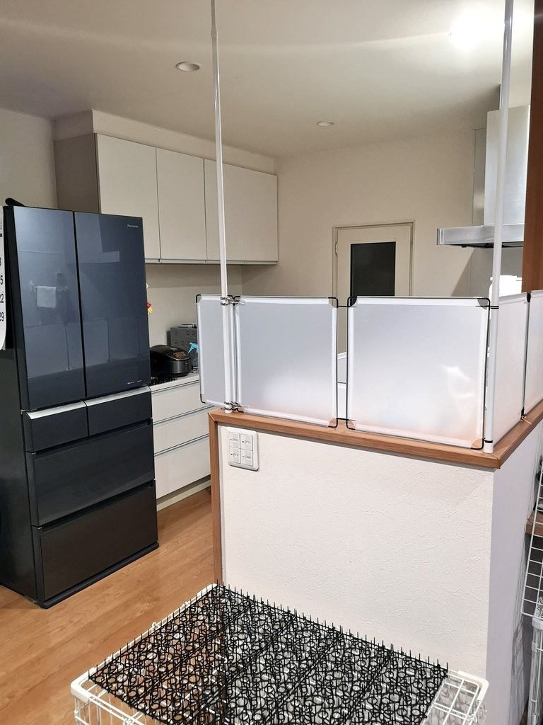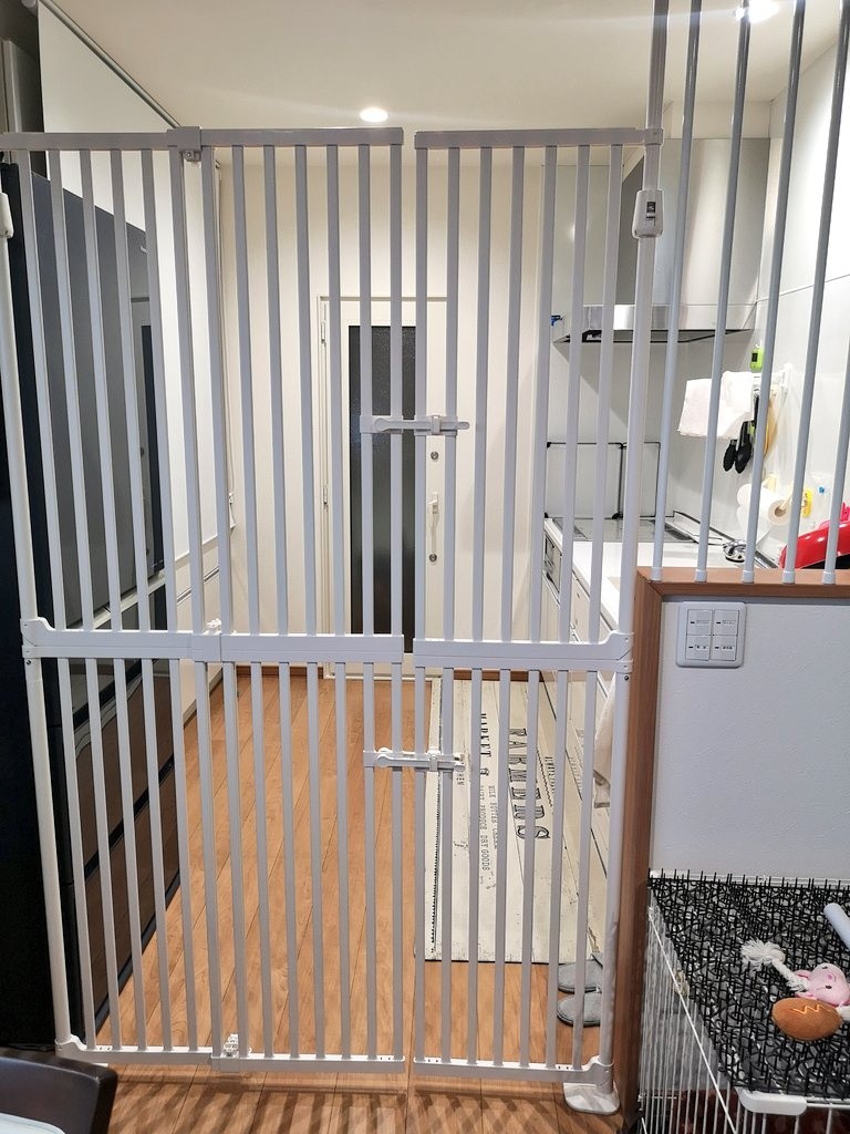 铲屎官用猫栅栏和伸缩杆,将厨房给围了起来。