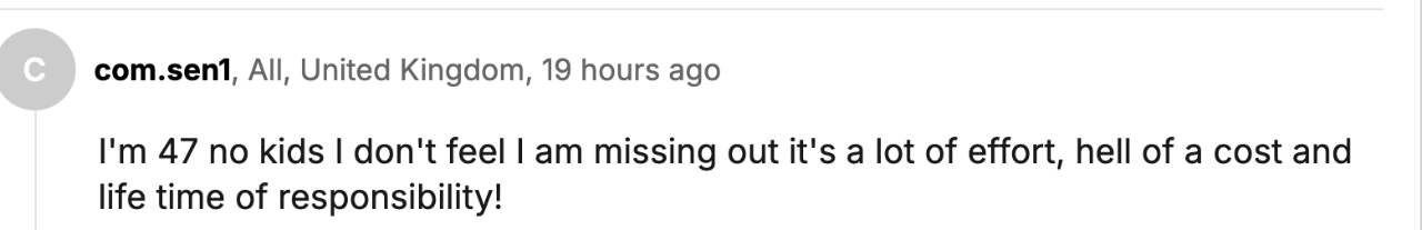 “我47,没娃,但我一点也不觉得自己错过了什么。养孩子要花很多精力,金钱,还要承担一辈子的责任!我觉得一点都不值”。