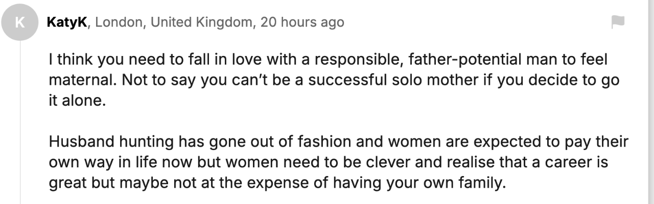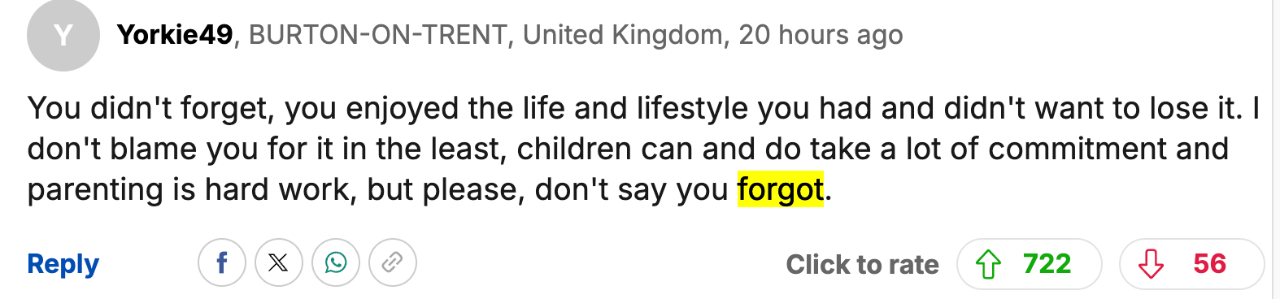 “你不是‘忘了生孩子’,而是你当时在享受你所拥有的生活,并且不想改变。我不是想要杠你,养孩子确实需要大量投入,做父母也真的很辛苦。但请别说你是‘忘了生孩子’。