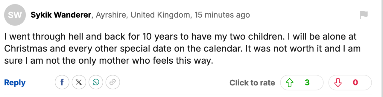 也有一位女士给了Nadiya很好建议。她只是在圣诞节这种浓厚的节日氛围下,才有了这种感受。如果每年只有一天,而不是大多数时候都期盼孩子的陪伴,Nadiya可能还是不要孩子比较好。
