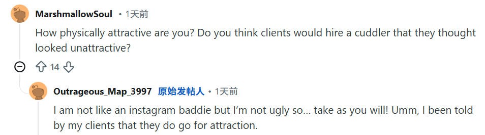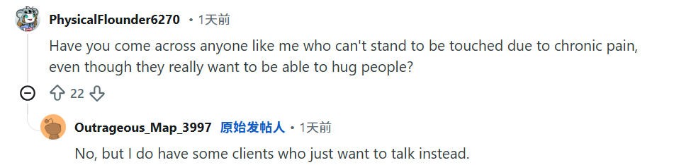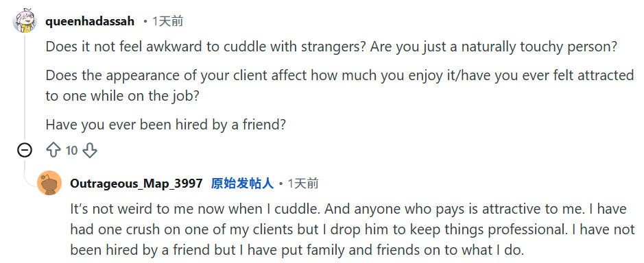 这两天,Reddit论坛上一位23岁的职业拥抱师的帖子也挺火,她从事这项工作已经一年,贴子里网友问了各式各样的问题,她都一一做了解答。