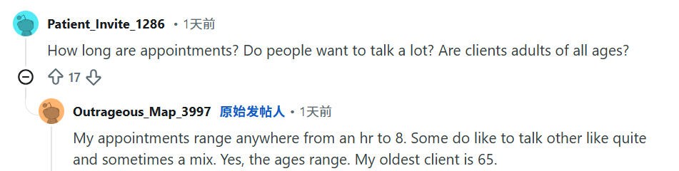 答:我的治疗时间是从1小时到8小时不等。有些人喜欢说很多话,有的人喜欢安静,有时候是时而安静时而多话。没错,客户年龄跨度很大,我的客户里最大的客户是65岁。