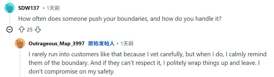 答:我很少遇到那样的客户,因为我会仔细筛选客户,但如果遇到了,我会平静地提醒他们注意界限。如果他们不尊重我的界限,我会礼貌地结束服务并离开。我不会在自身安全问题上妥协。