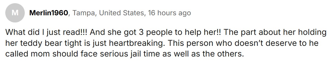 “我都读了些什么!!她竟然还找了三个人来帮忙!!女儿紧紧抱着泰迪熊那一块真让人心碎。这个不配称之为‘妈妈’的人,还有她的帮凶,都应该被判重刑。”